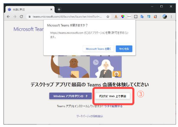 - ③Webブラウザが起動しますので、「代わりにWeb上で参加」をクリックします。
