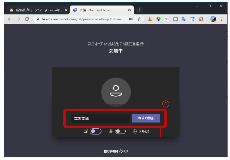 - ④「名前を入力」欄に参加者名を入力し、「今すぐ参加」をクリックしてWeb面接に参加します。