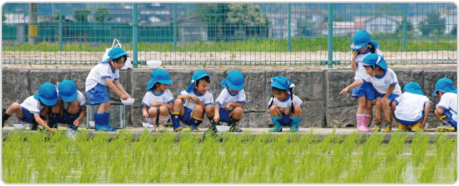 自然や友達との触れ合いを深める栽培活動や園外保育を重視しています。(野菜や花の栽培、園外での自然体験、身近な社会施設での心動かされる体験を計画的に進めます。)